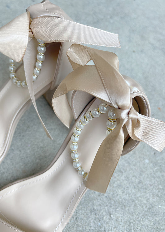 Trish Pearl Ankle Strap Bow Heels in Sand