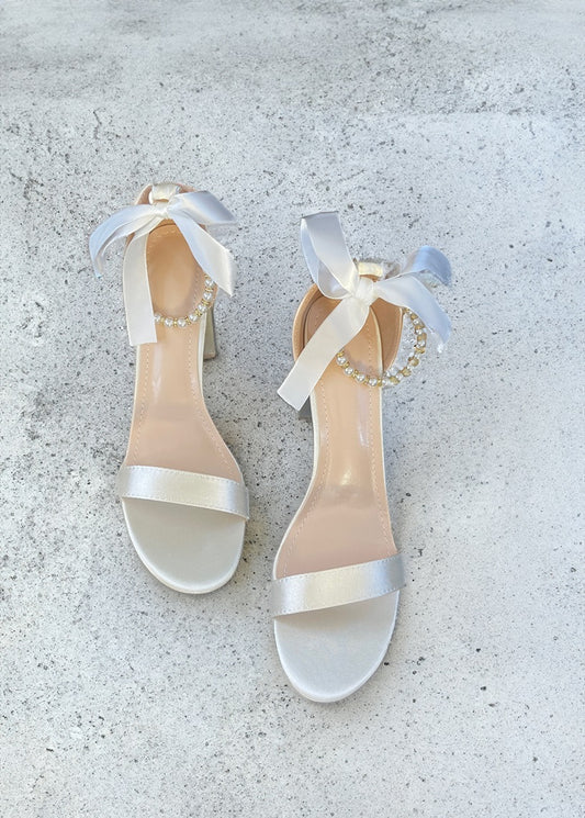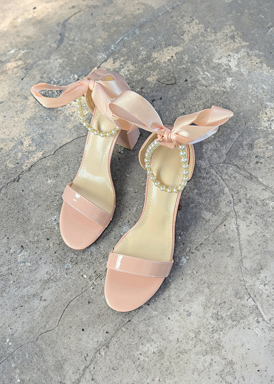 Trish Pearl Ankle Strap Bow Heels in Sand