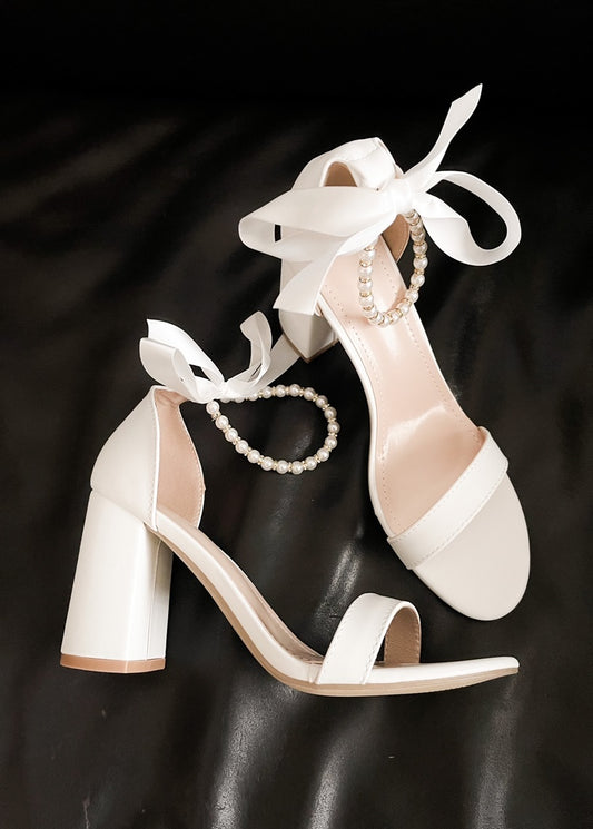 Trish Pearl Ankle Strap Bow Heels in White
