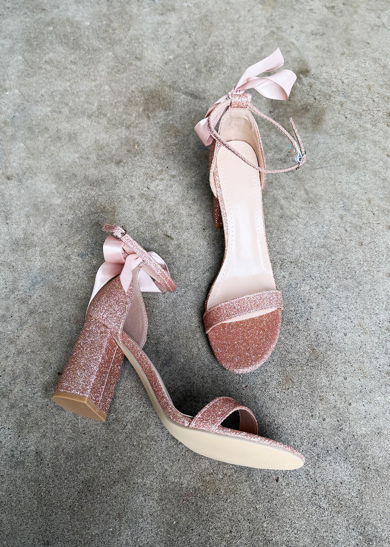 Trish Ankle Strap Bow Heels Glitter Rose Gold